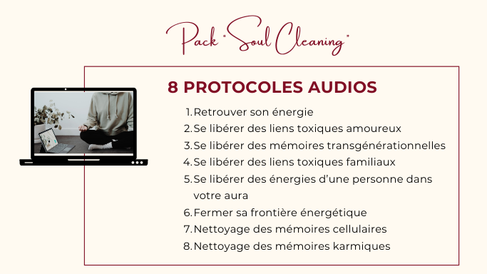 énergétique. Si tu es accompagnant ou entrepreneur spirituel, que tu fais des séances individuelles ou de groupe avec des clients, il te permettra de préserver ton aura et de préserver ton énergie. Tous les protocoles sont pré-enregistrés, tu as juste à te laisser guider par l'audio.